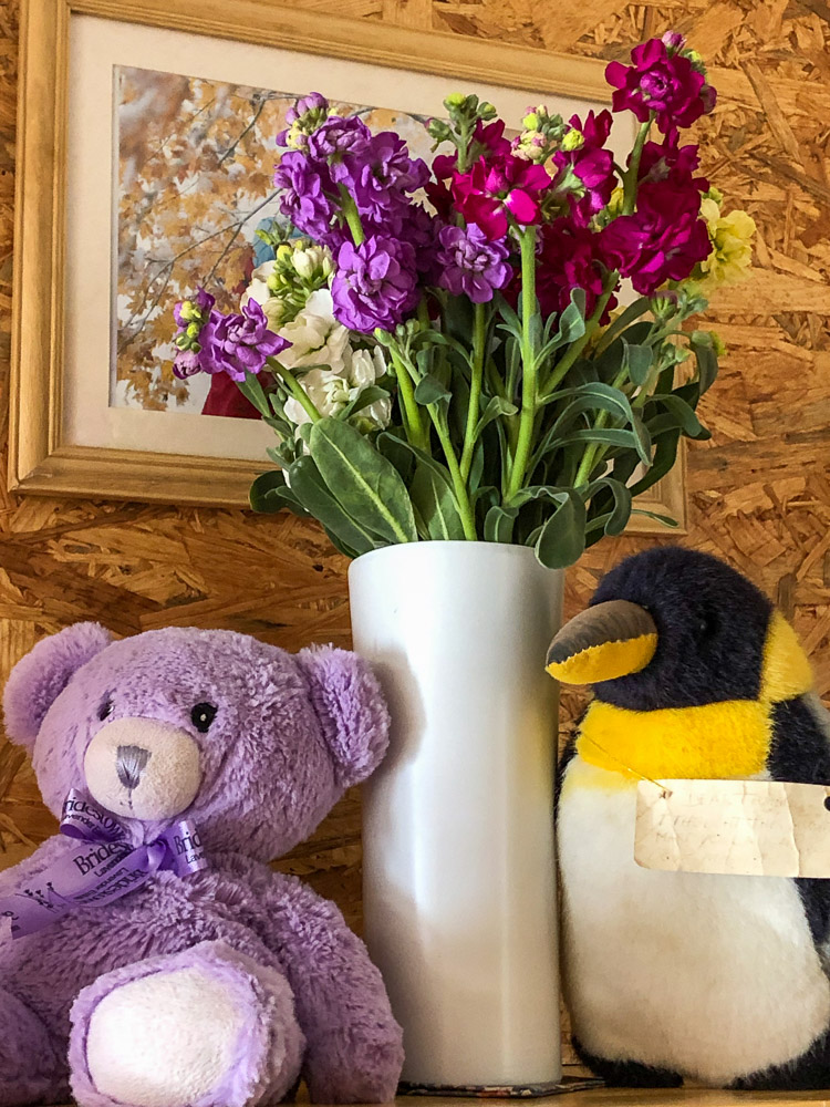 入り口ではロッジのマスコット、タスマニアのラベンダーテディーとペンギンも春の訪れを喜んで皆さんのお出迎えをしています。(笑顔)