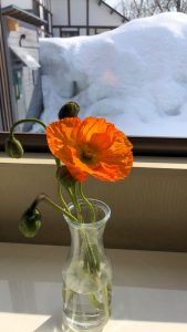 まだまだ、ロッジの周りは6メートルを超える雪の壁ですが、部屋に入ってくるとホッとする春の香りがそこら中に漂っています。ストック、キンセンカ、そしてポピー。